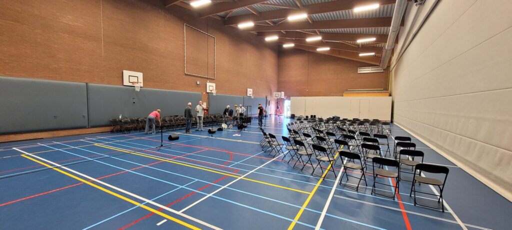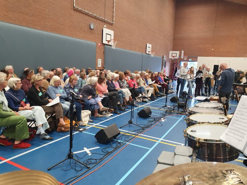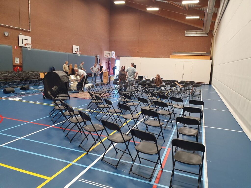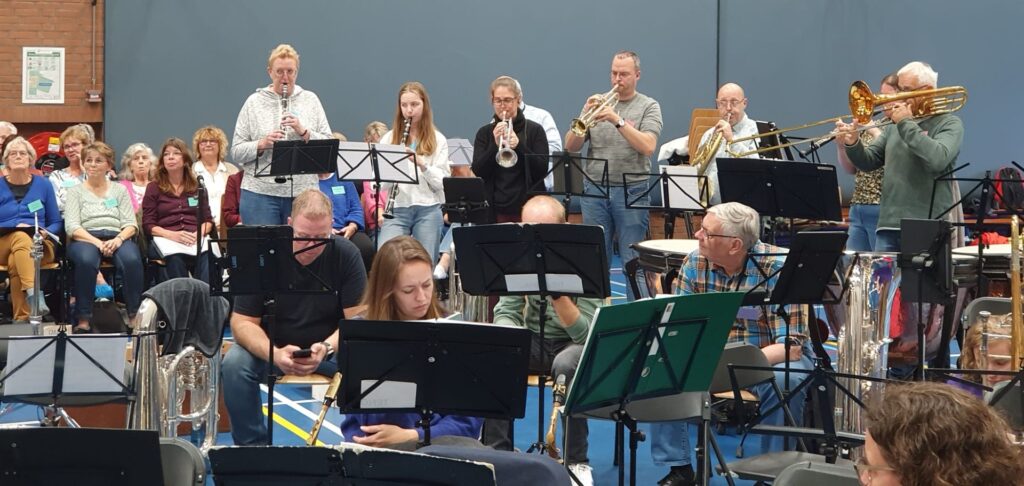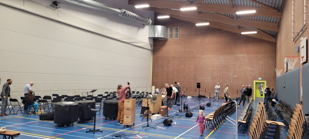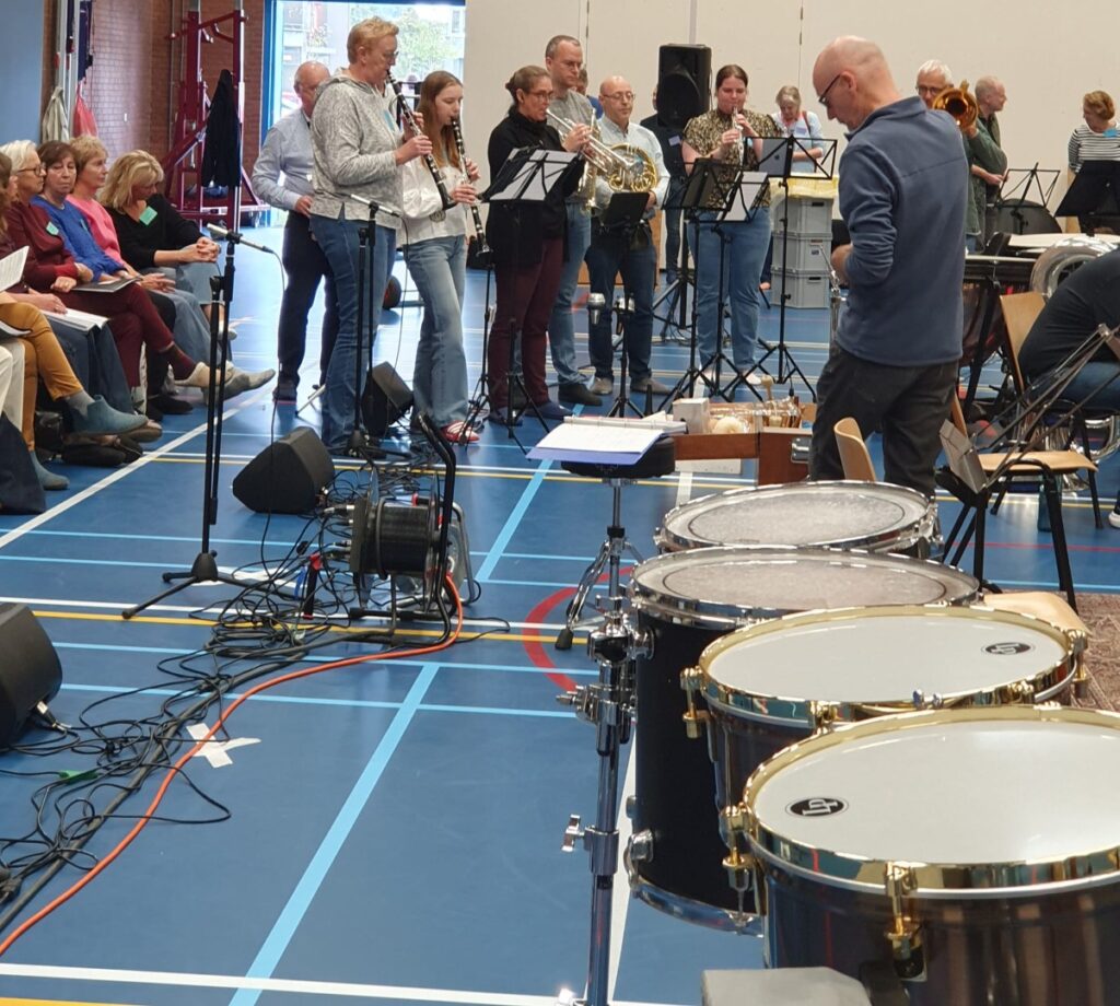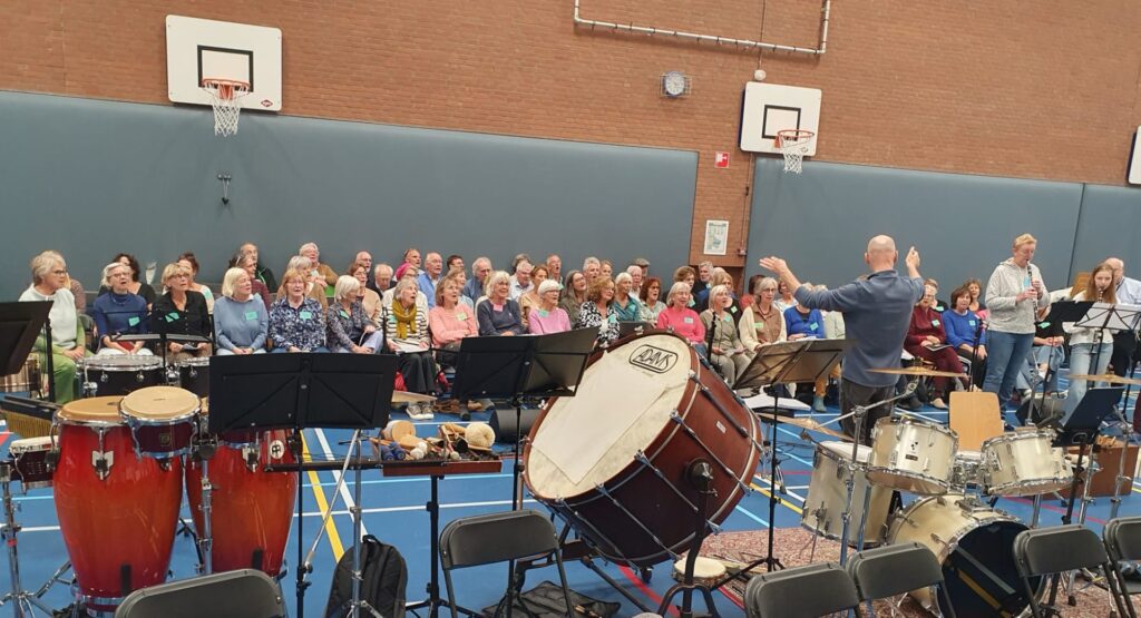 Afgelopen zondag kwamen koor en orkesten voor de tweede keer samen voor een intensieve repetitie van bijna vier uur. Deze vond plaats in de sporthal van De Scheg in Deventer. Onder de bezielende leiding van de drie dirigenten werd hard gewerkt aan de muziek, met veel enthousiasme en toewijding van alle deelnemers.